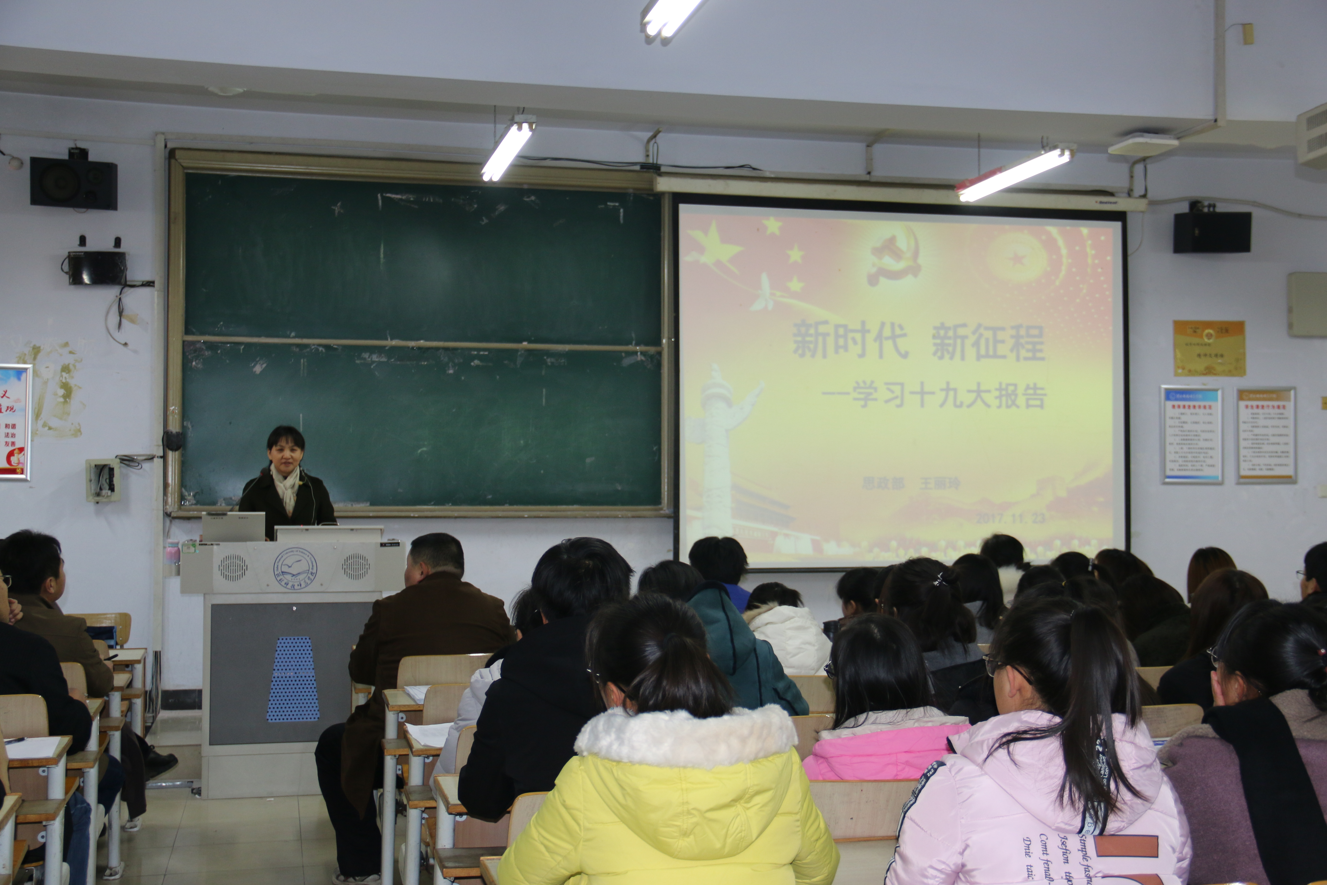 王丽玲老师从党的介绍十九大盛况开始,围绕着新时代、新思想、新方略、新战略、新举措对十九大报告进行了详细的解读,引领大家从社会主义发展的历史、从党的发展历程来理解、从十八大以来取得的非凡成就、从全国各族人民的期盼、从对党和国家面临的问题和挑战的回答等多个维度来理解十九大精神,诠释了全党全国人民坚持道路自信、理论自信、制度自信和文化自信和重大意义。