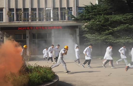 下午2时50分演练总指挥发出紧急警报。任课教师组织学生从实验室迅速撤离,实验室工作人员分楼层组织学生撤离,楼外引导员组织学生逆风向疏散至实验楼东侧。到达临时集中地后,任课教师检查学生情况,向演习指挥员报告情况,对受伤人员进行临时救治并及时送医。
